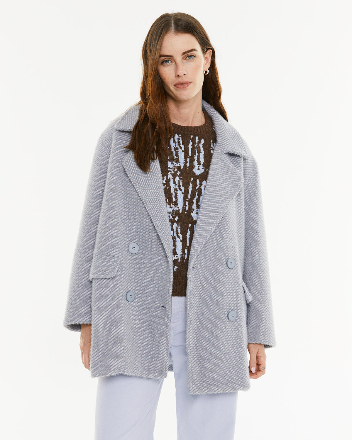 Abrigo de mujer de bouclé, escote con solapa, con cuatro botones en la parte delantera y bolsillo con tapeta. Prenda sostenible.