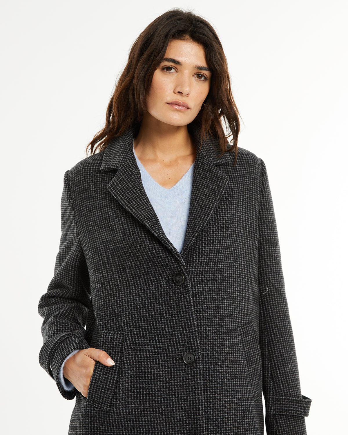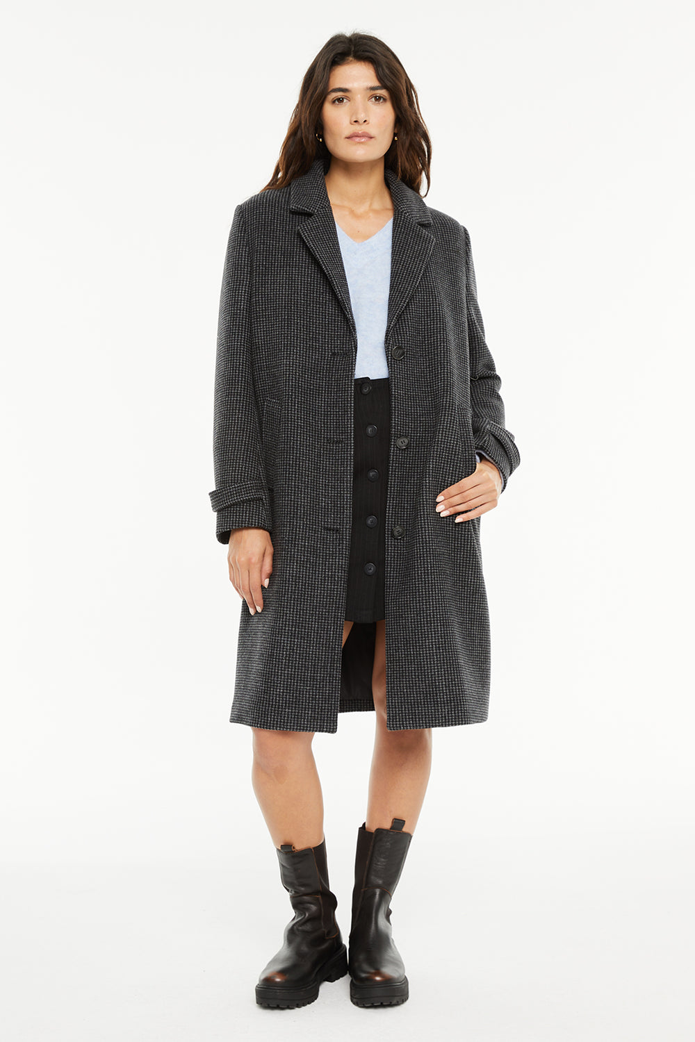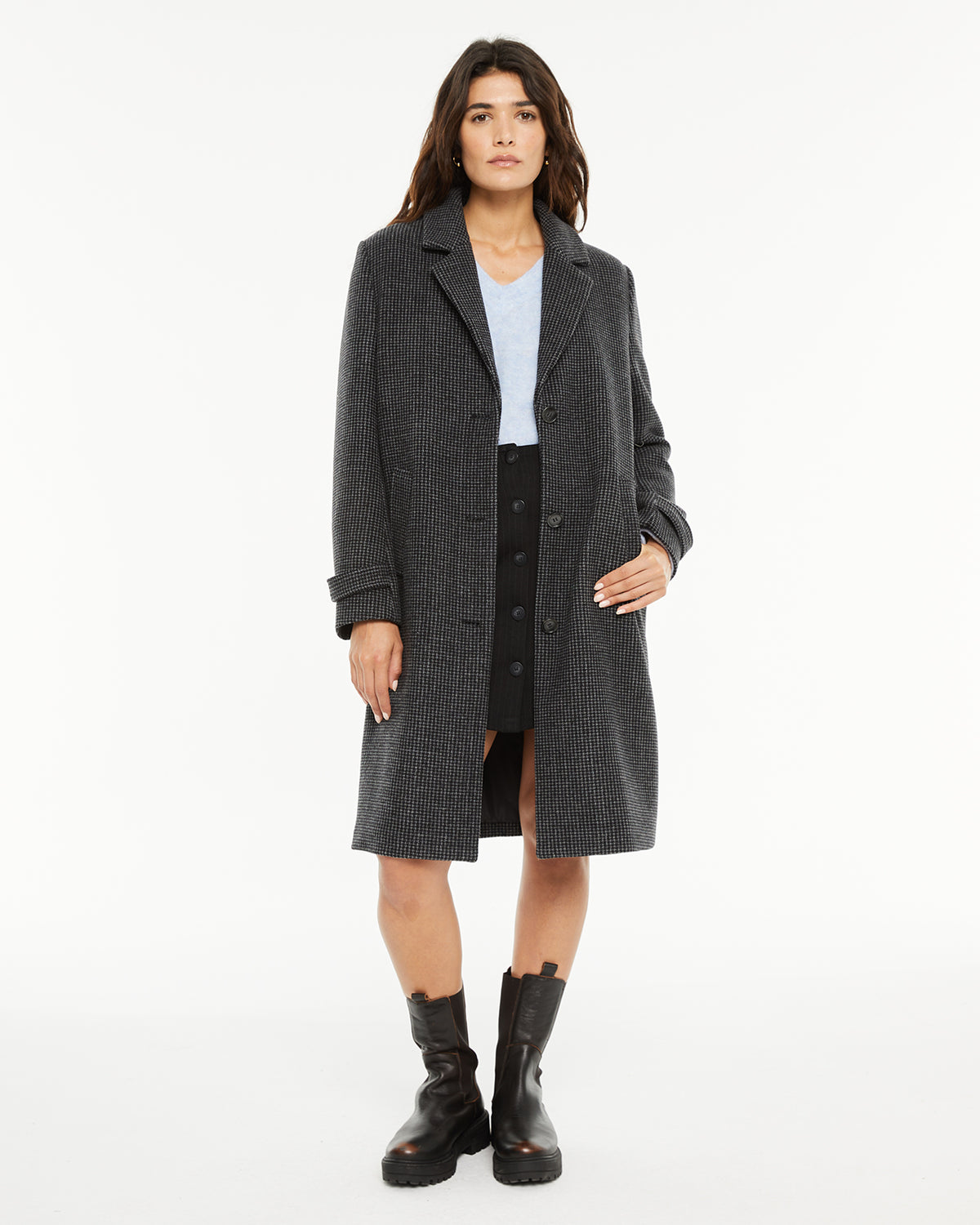 Abrigo de mujer con tejido de fantasía, cuello con solapa, cierre con botones y bolsillos en la parte delantera.