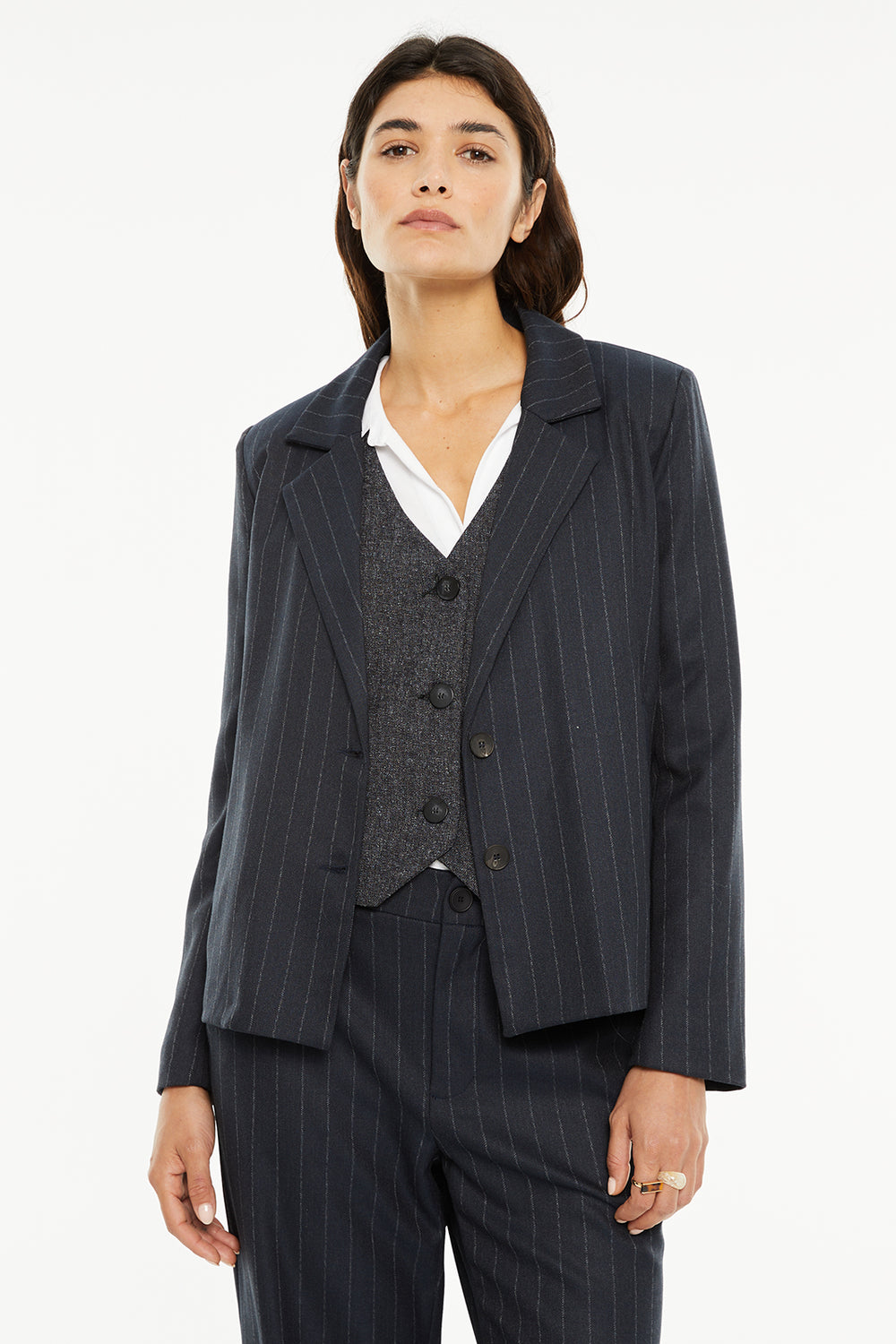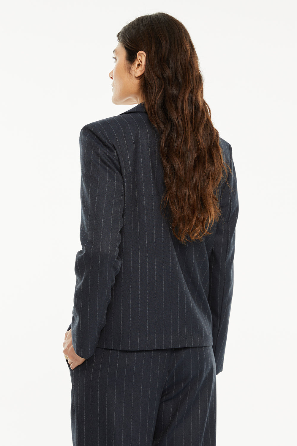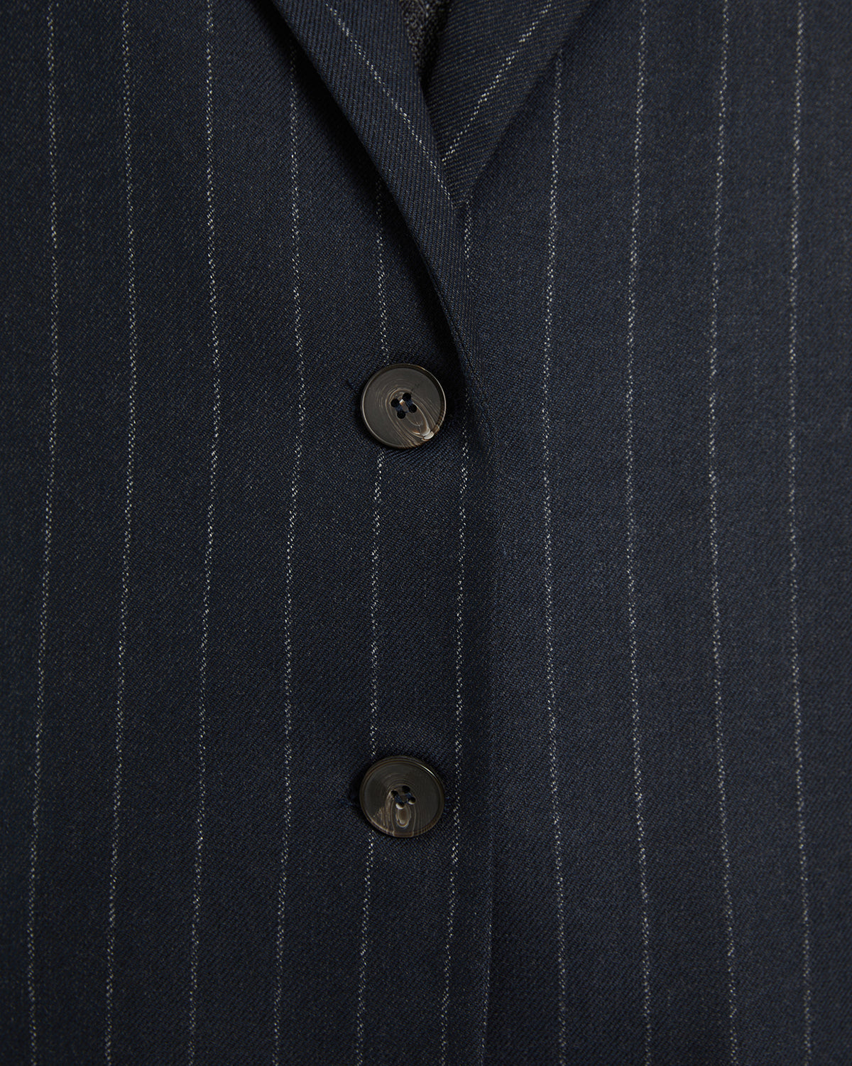 Americana de mujer con raya diplomática, escote con solapa y cierre con botones.