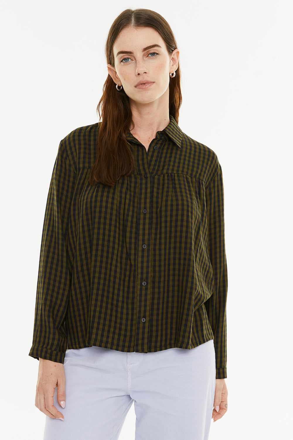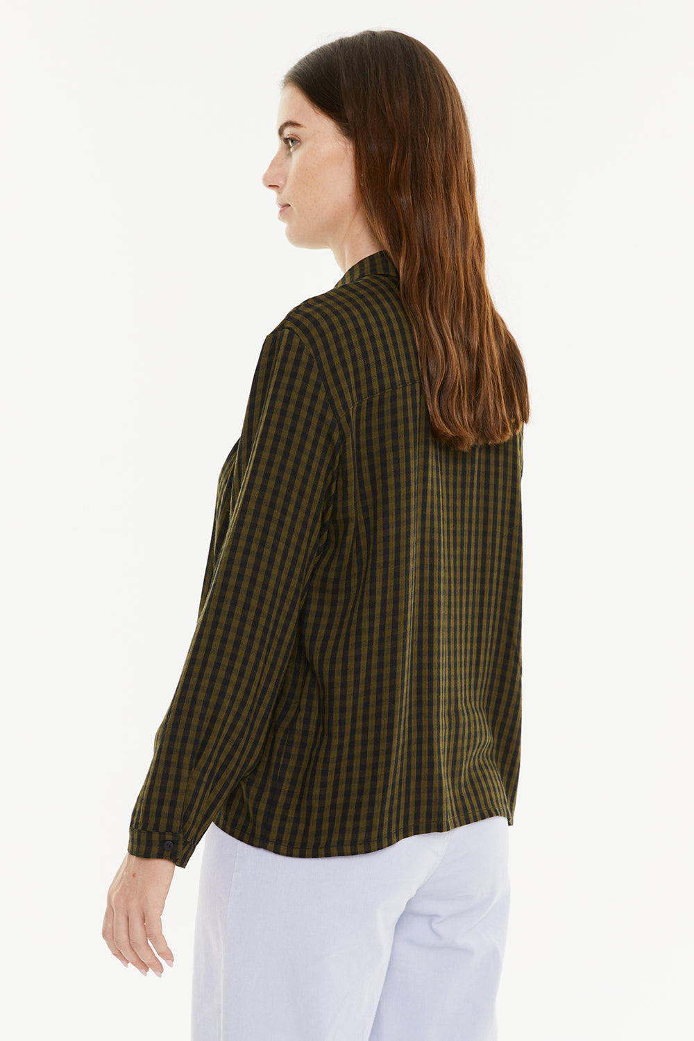 Camisa de mujer con tejido de cuadros, escote camisero y cierre con botones. Prenda sostenible.