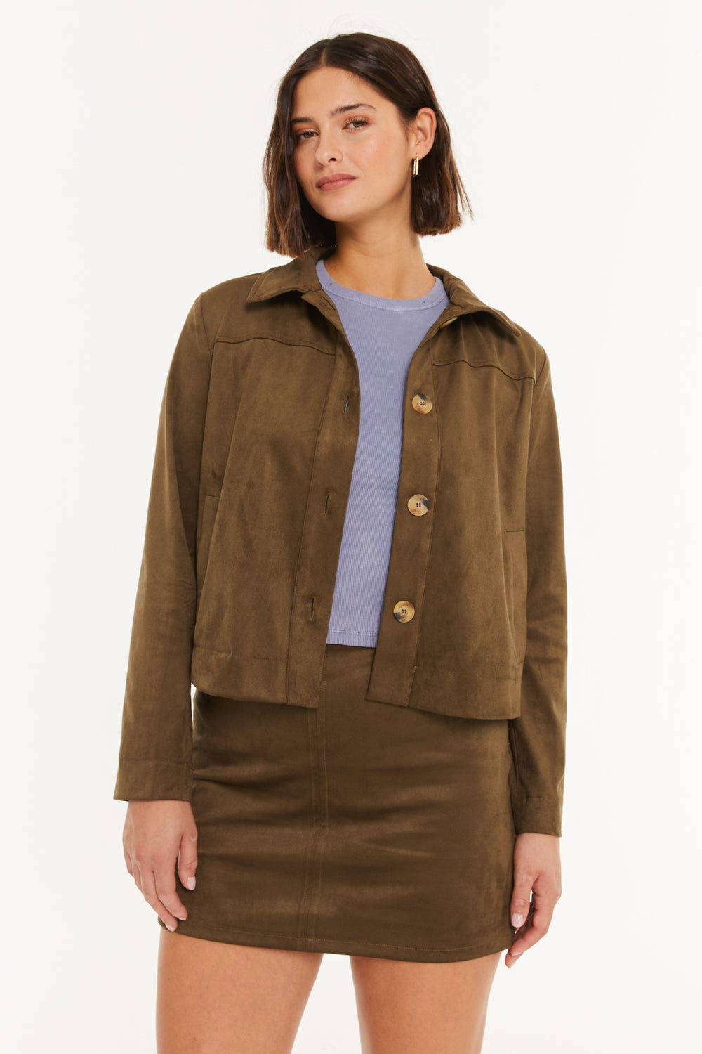 Chaqueta de mujer de antelina, con cuello camisero y cierre con botones.