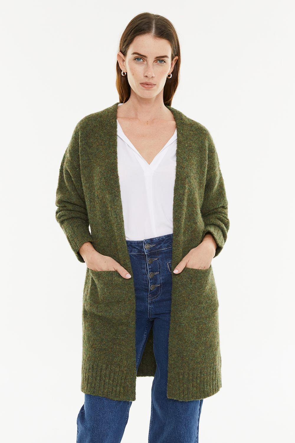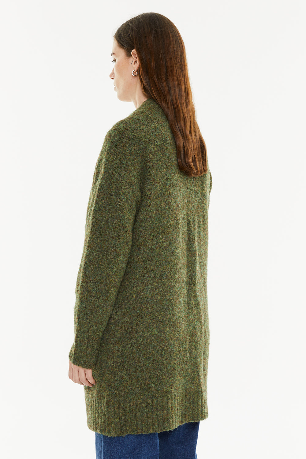 Chaqueta de punto de mujer, de talle largo, con bolsillos en el delantero. Prenda sostenible.