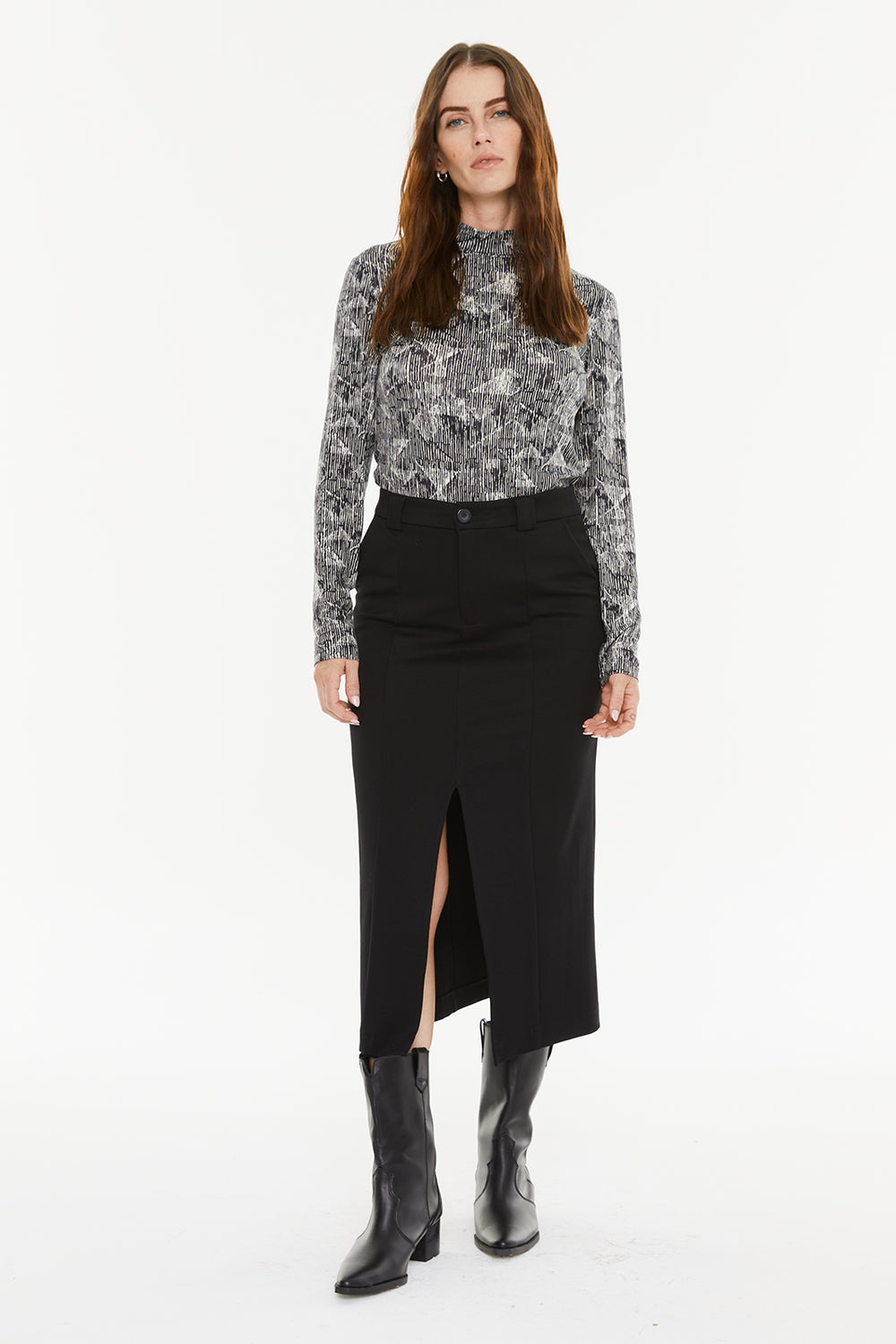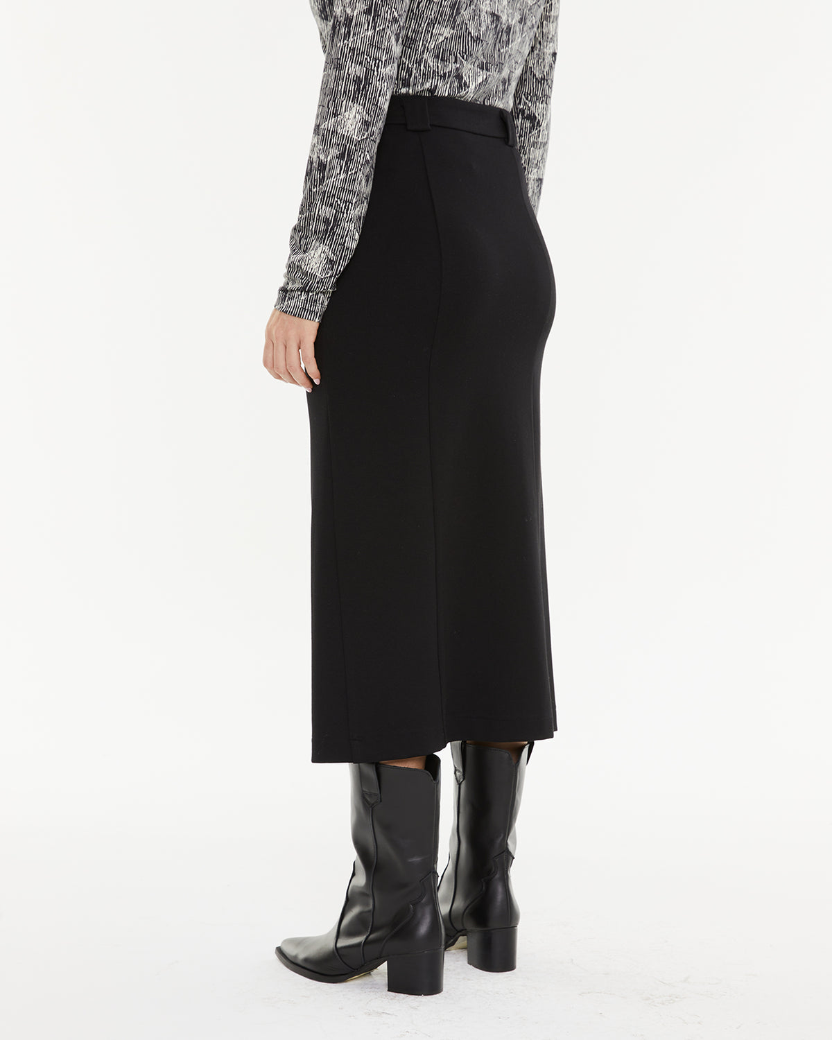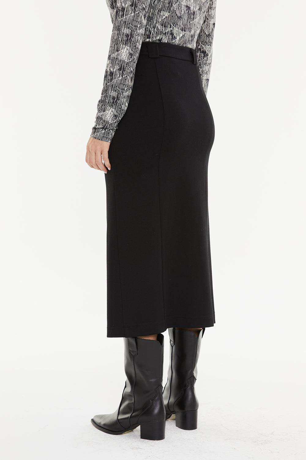 Falda lápiz midi de mujer con bolsillos laterales, abertura central en el delantero y cierre con botón.