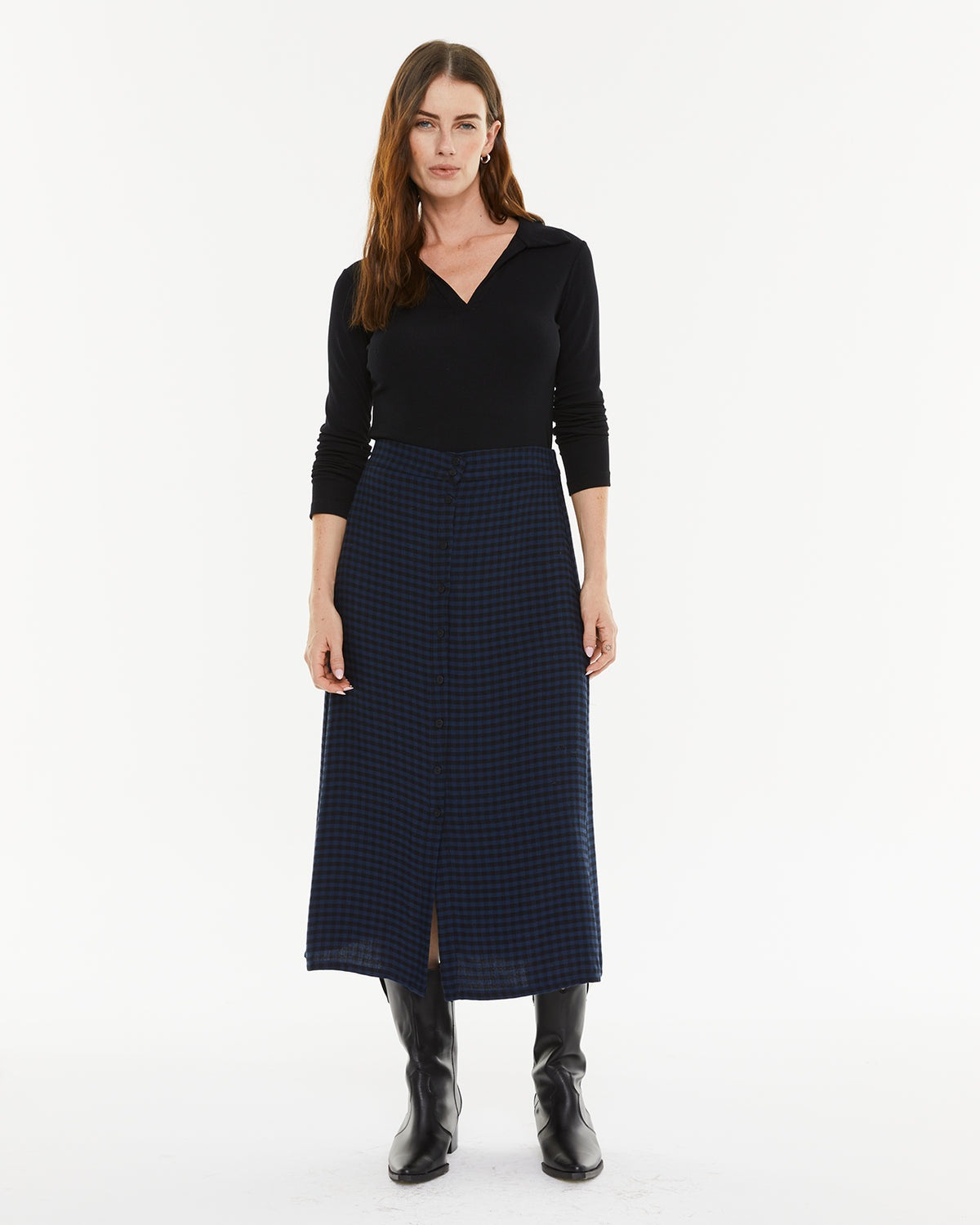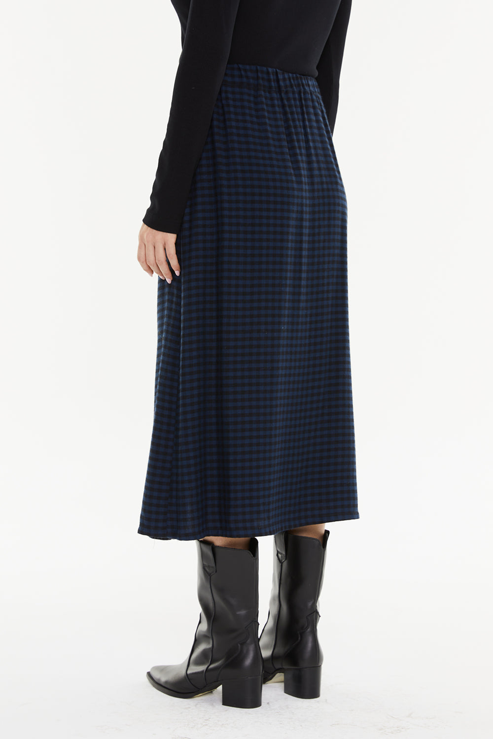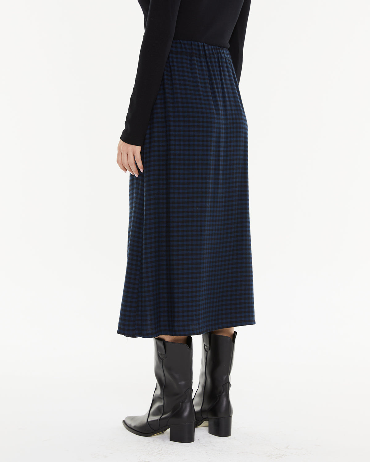 Falda midi de mujer con tejido de cuadros, goma en la espalda y detalle de botones en el delantero. Prenda sostenible.