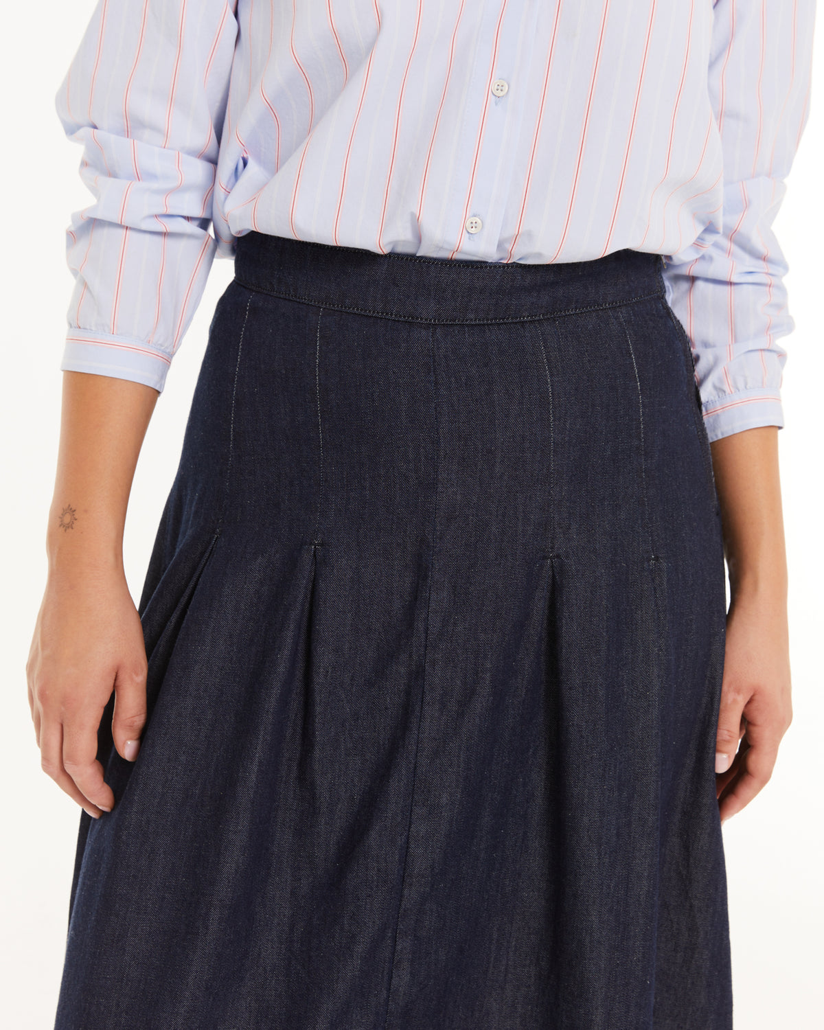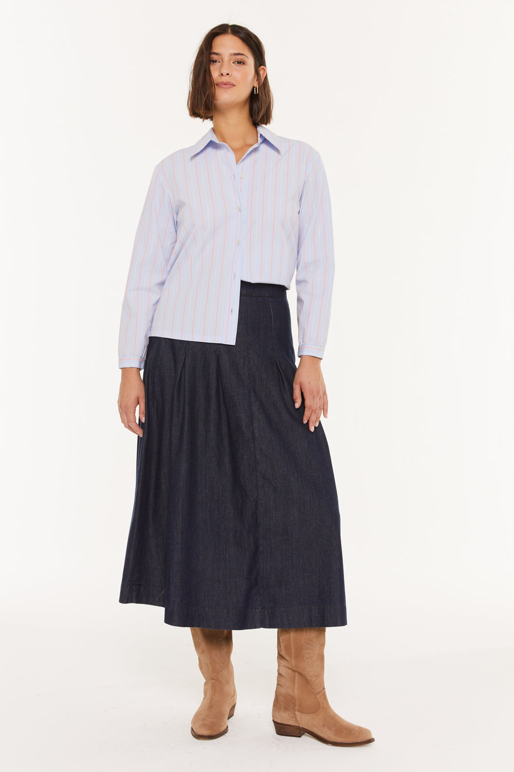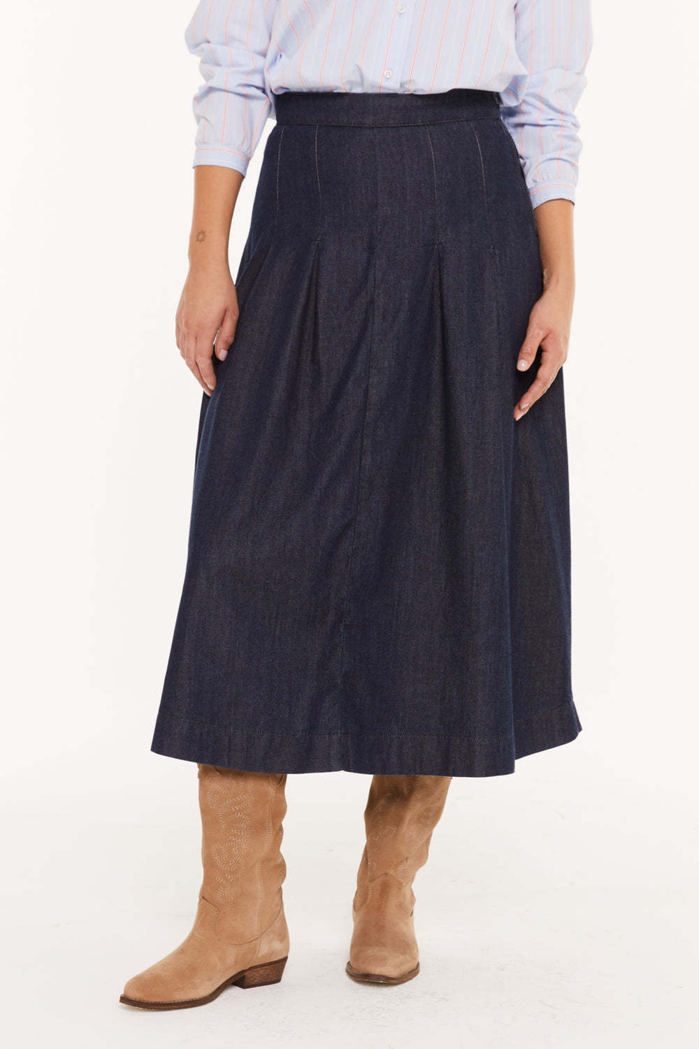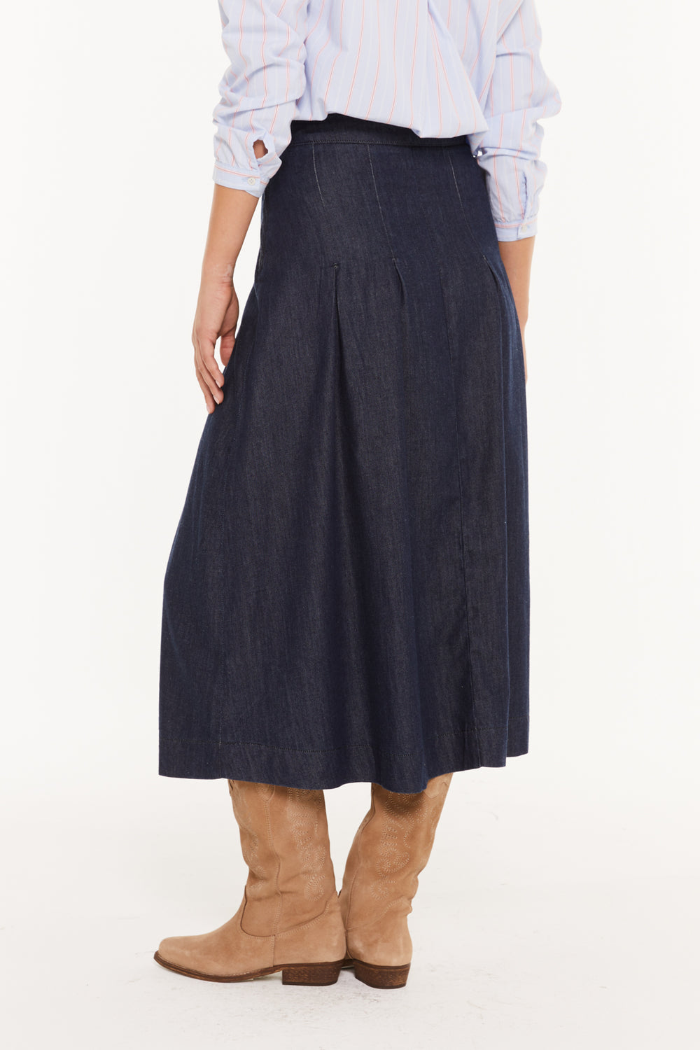Falda midi de mujer, con tejido denim fluido.