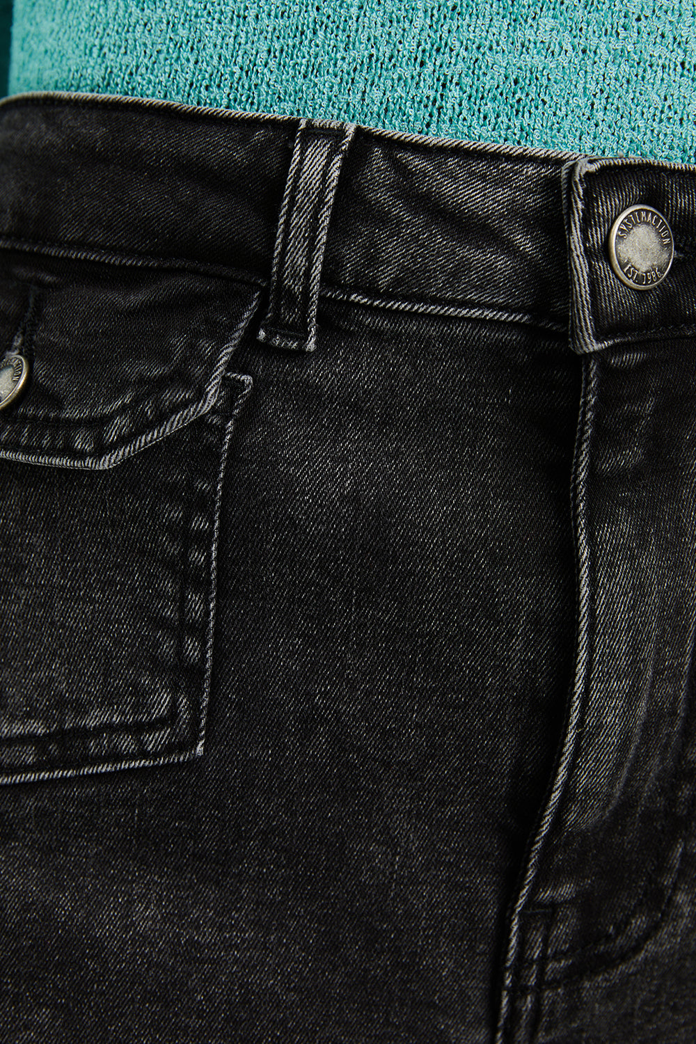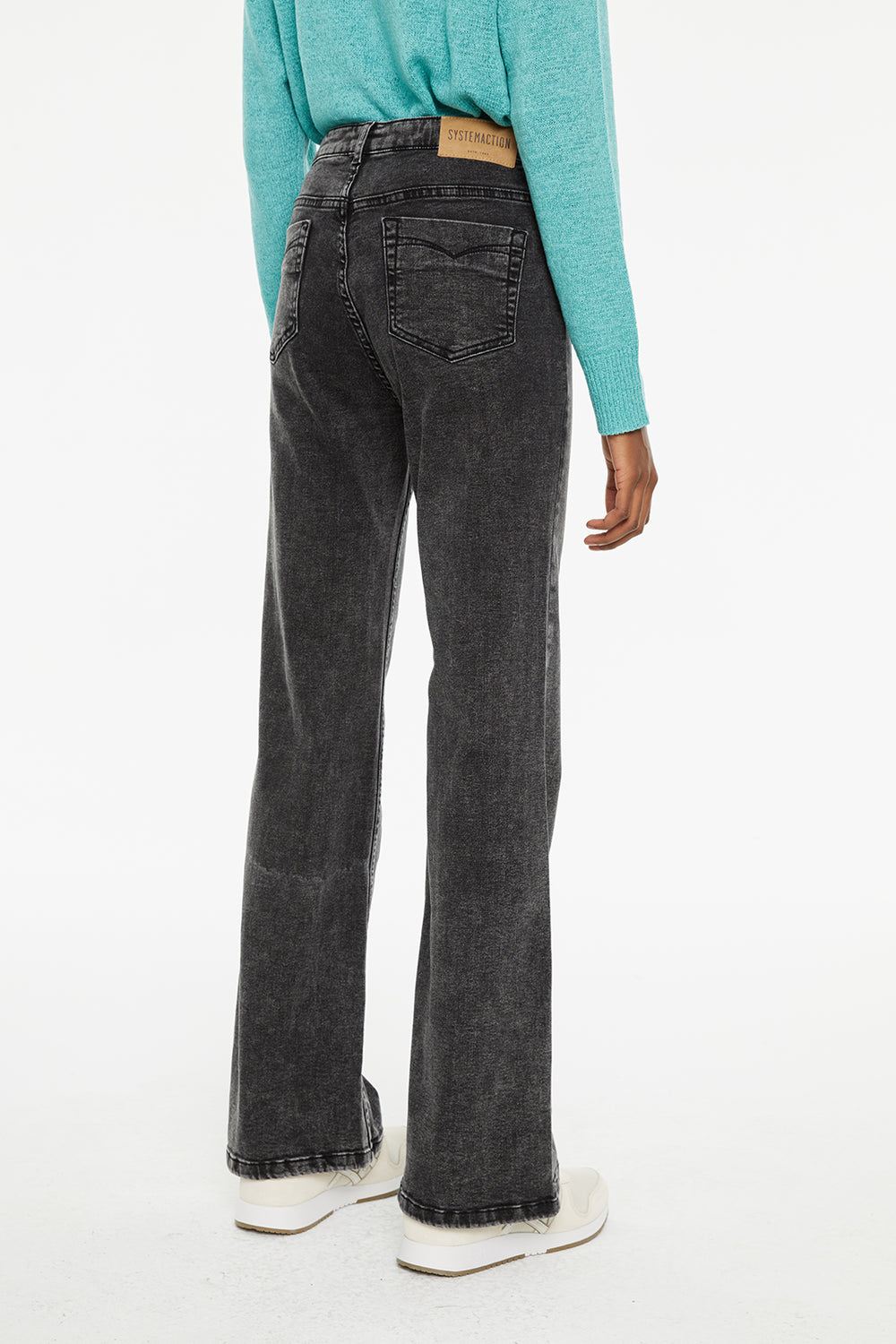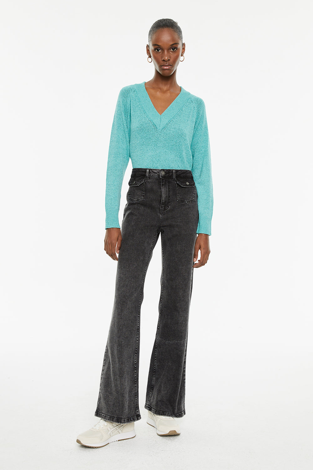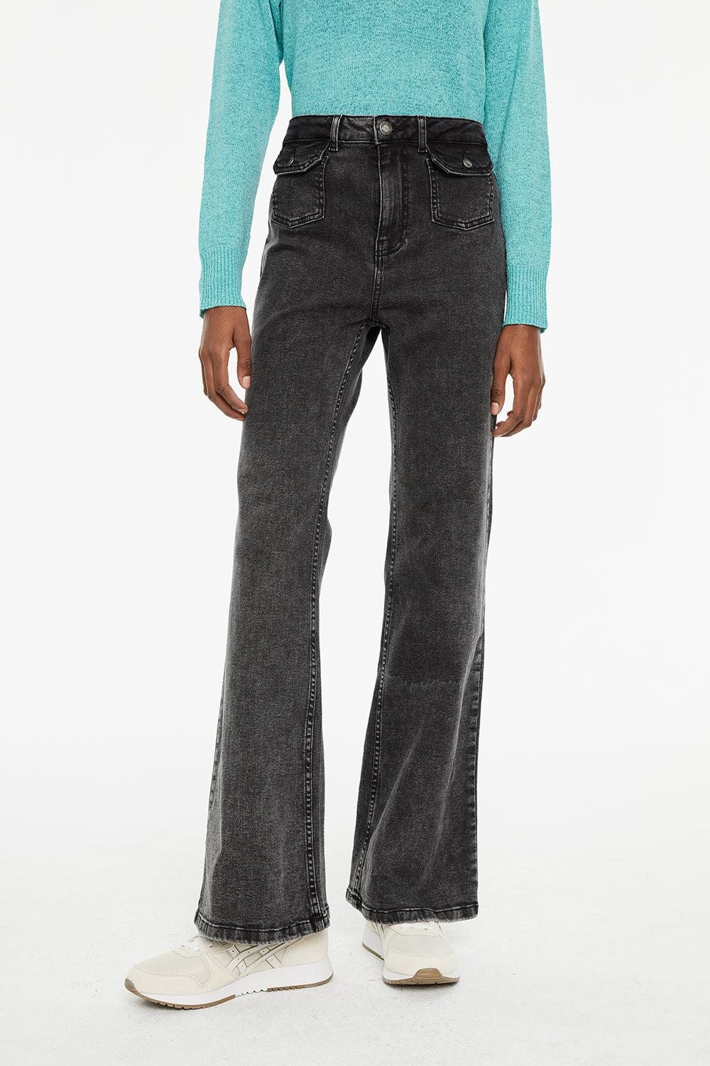 Jeans fit flare tiro medio detalle bolsillos delanteros