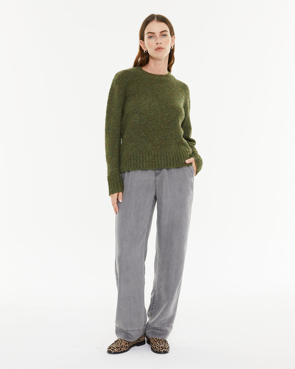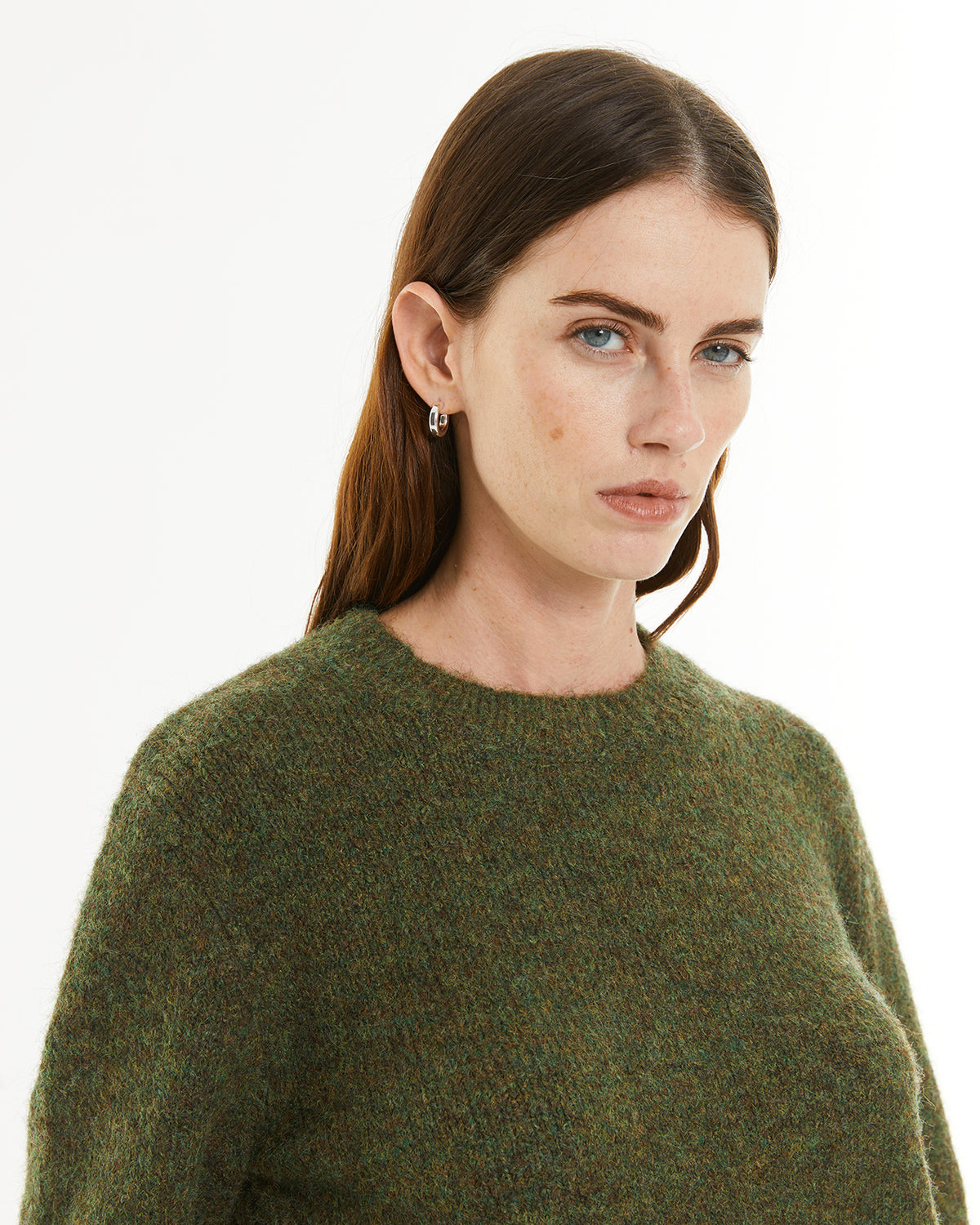 Jersey de mujer con escote redondo y acabados en rib. Prenda sostenible.