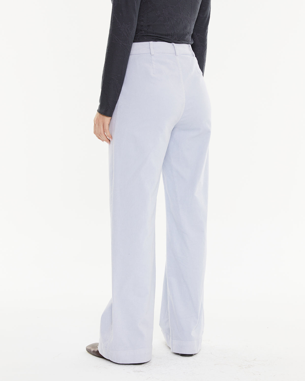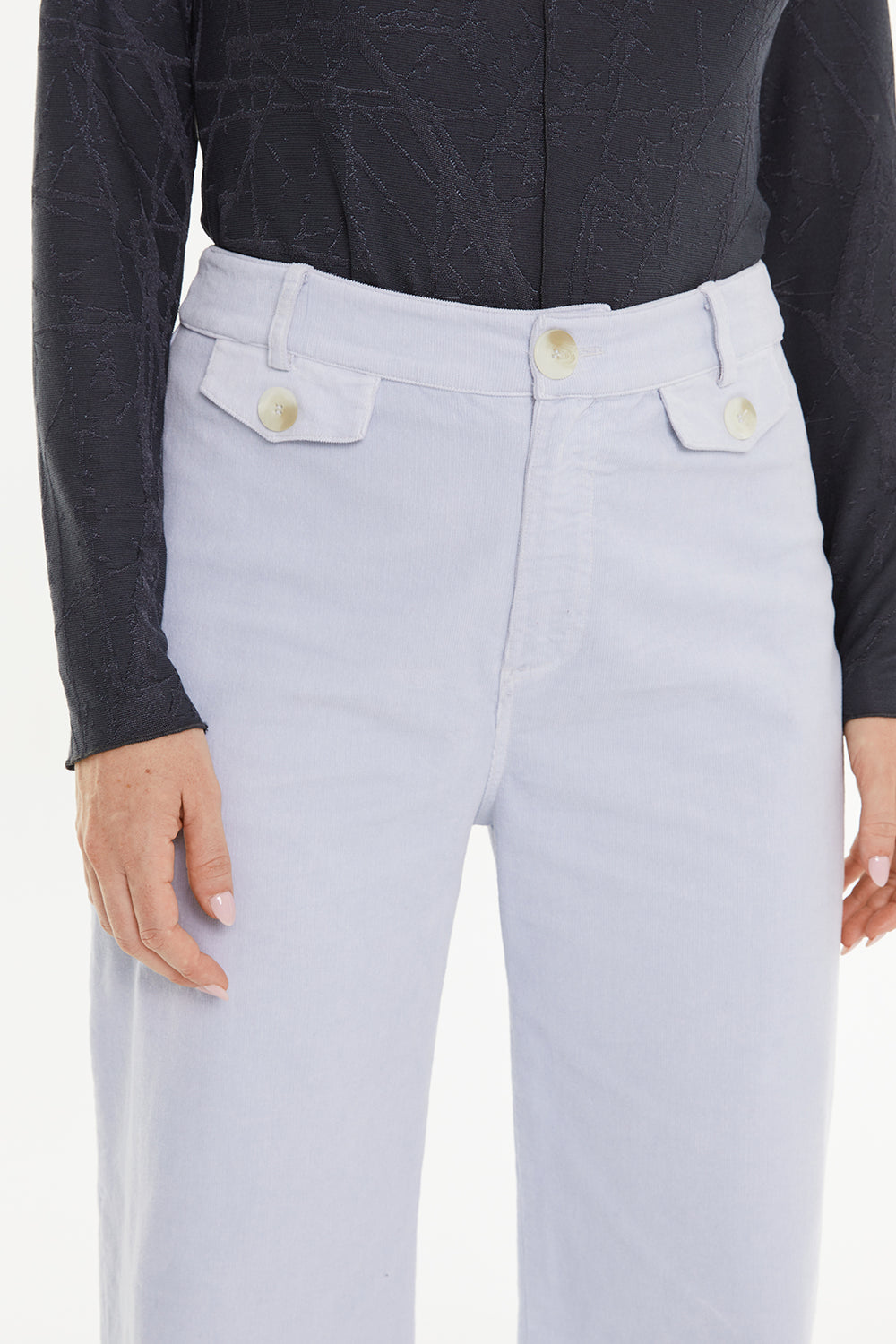 Pantalón de mujer con tejido de micropana, detalle de bolsillos con tapeta y botón en el delantero. Cierre con botón. Prenda sostenible.