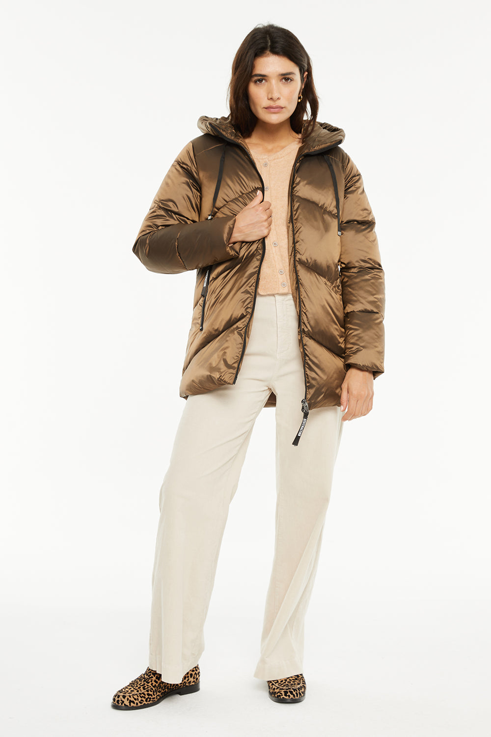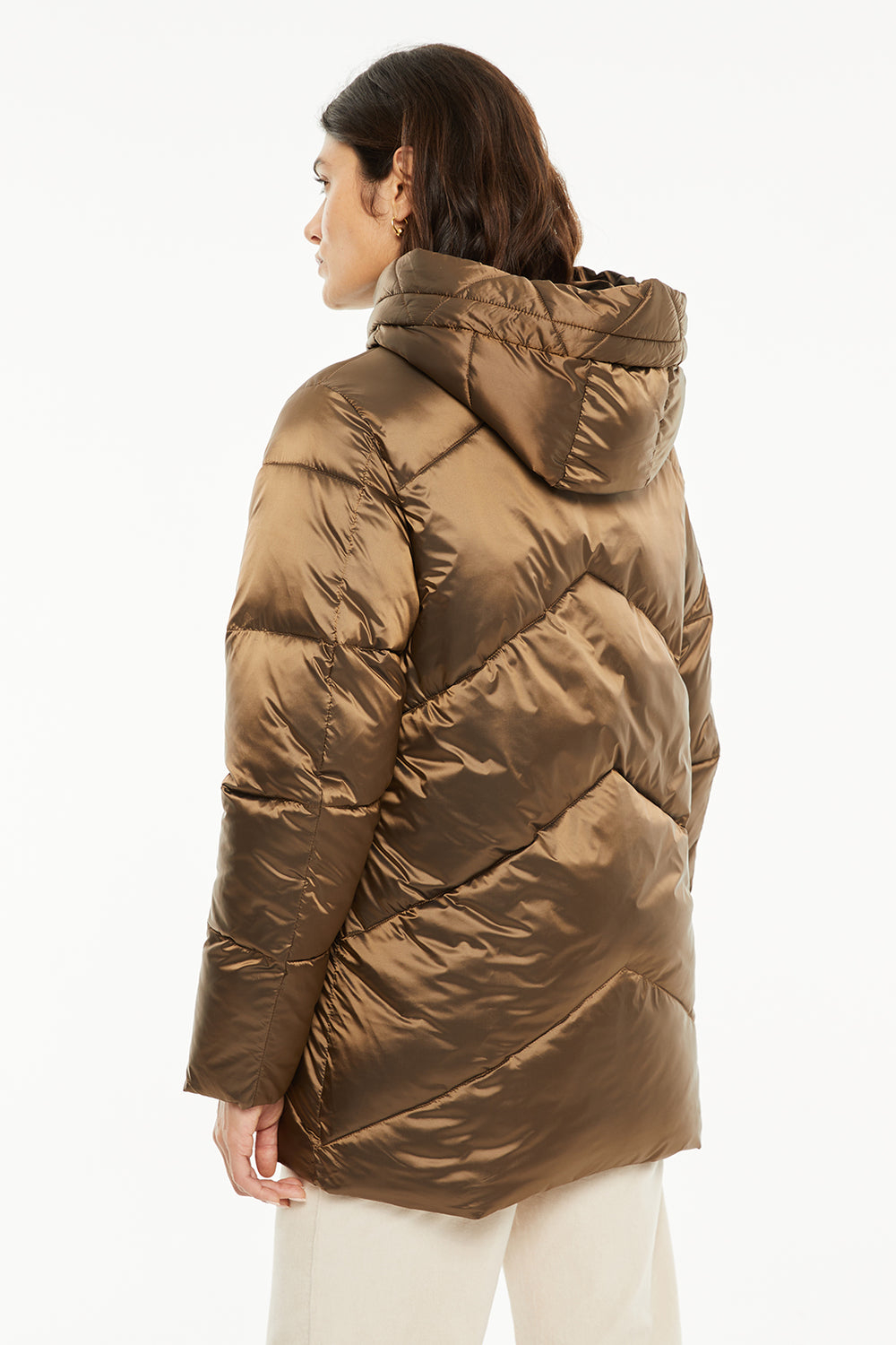 Plumón de mujer con capucha y cordón. Cierre con cremallera. Efecto metalizado.