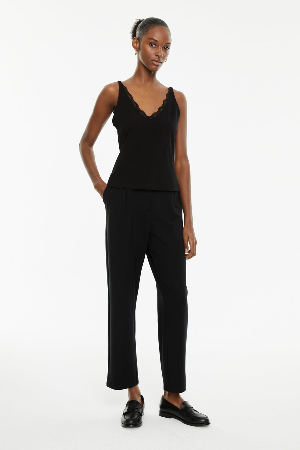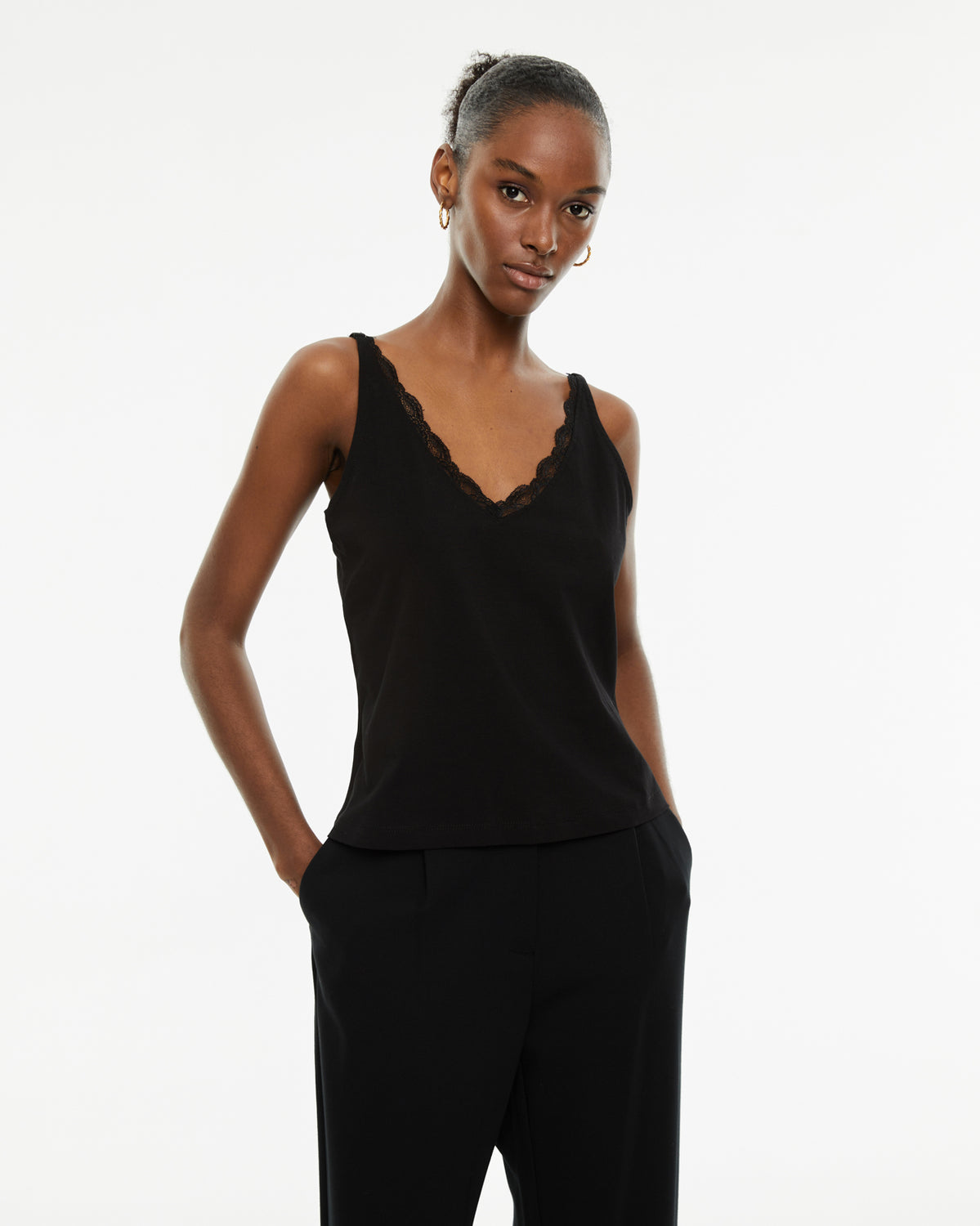 Top básico de mujer, ajustado, de tirantes, con escote pico y puntilla. Tejido algodón
