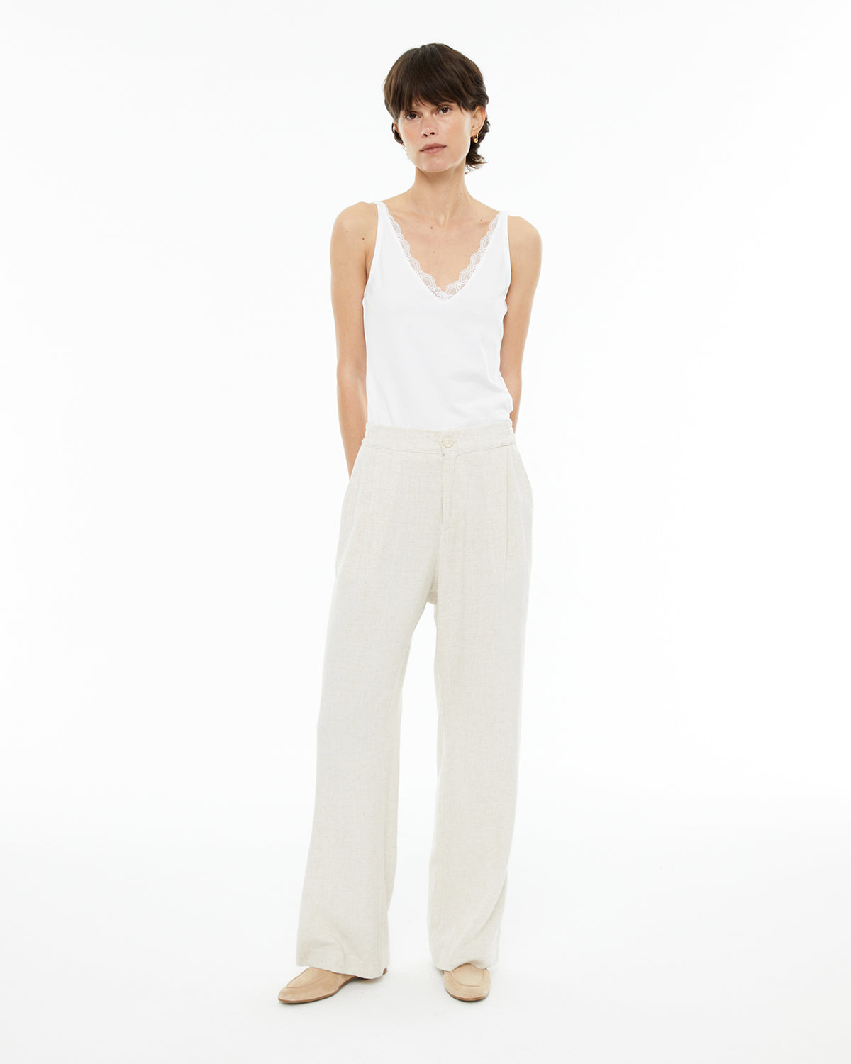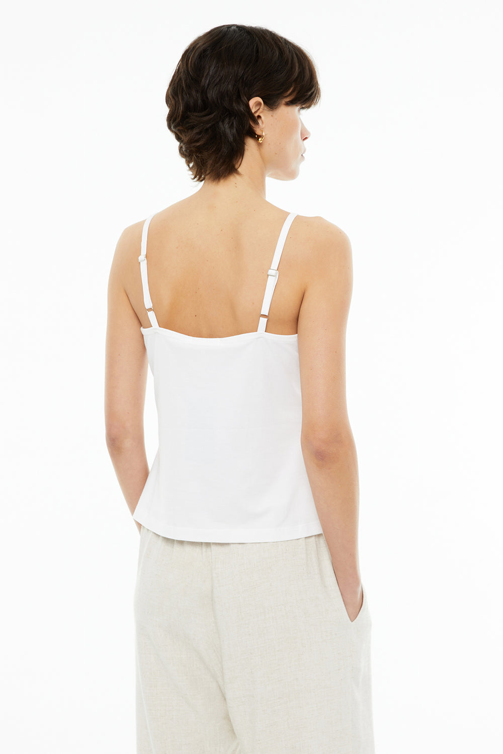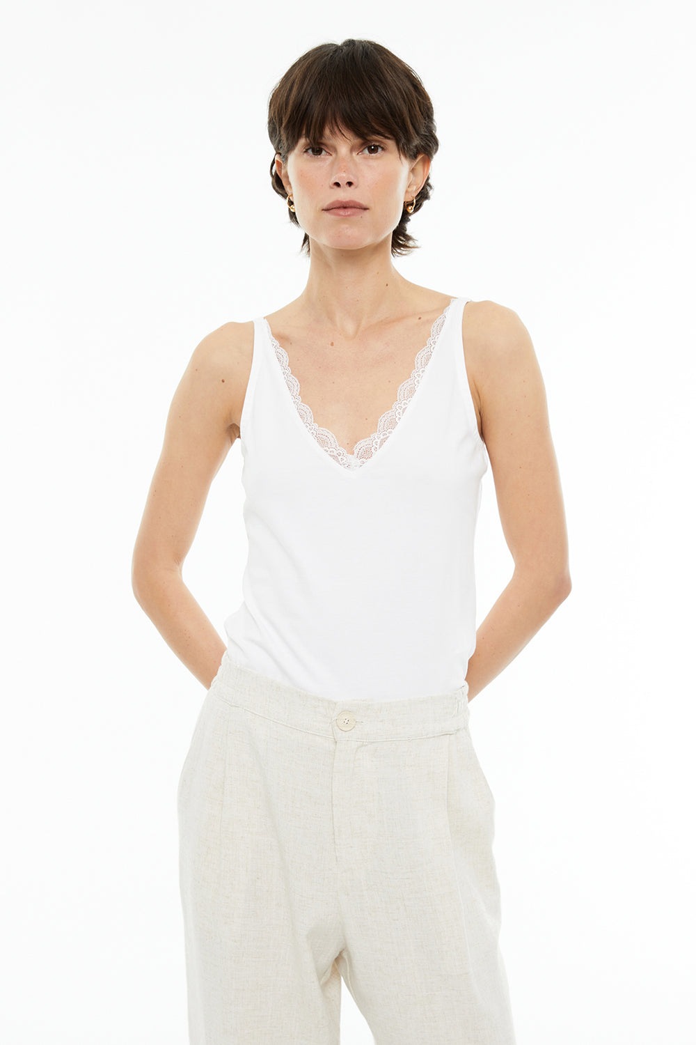 Top básico de mujer, ajustado, de tirantes, con escote pico y puntilla. Tejido algodón