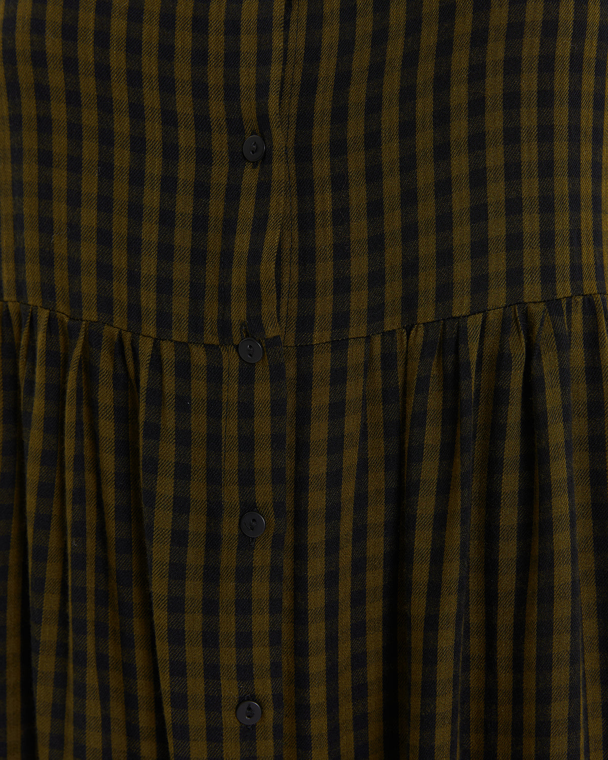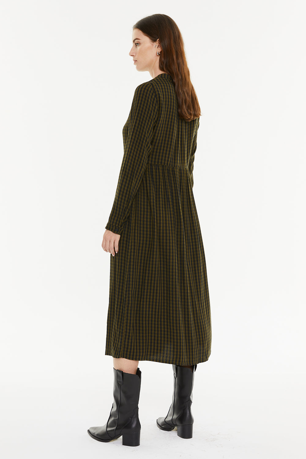 Vestido largo de mujer con tejido de cuadros, escote redondo y abotonado en el delantero. Prenda sostenible.