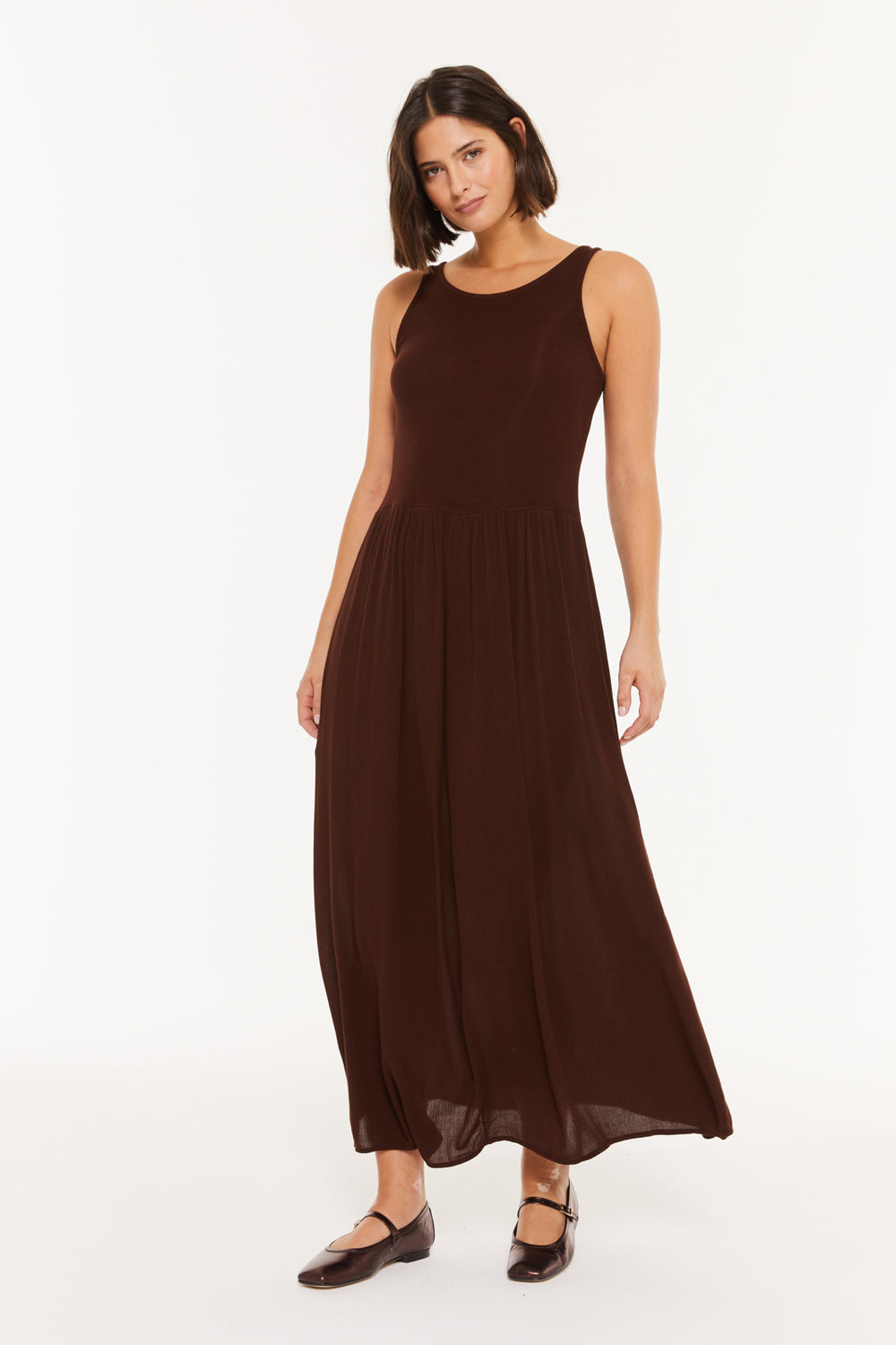 Vestido largo combinado con tejido de punto y plana