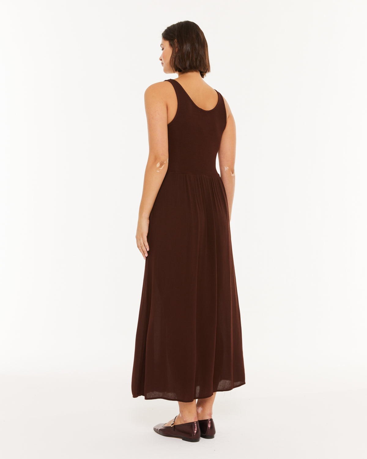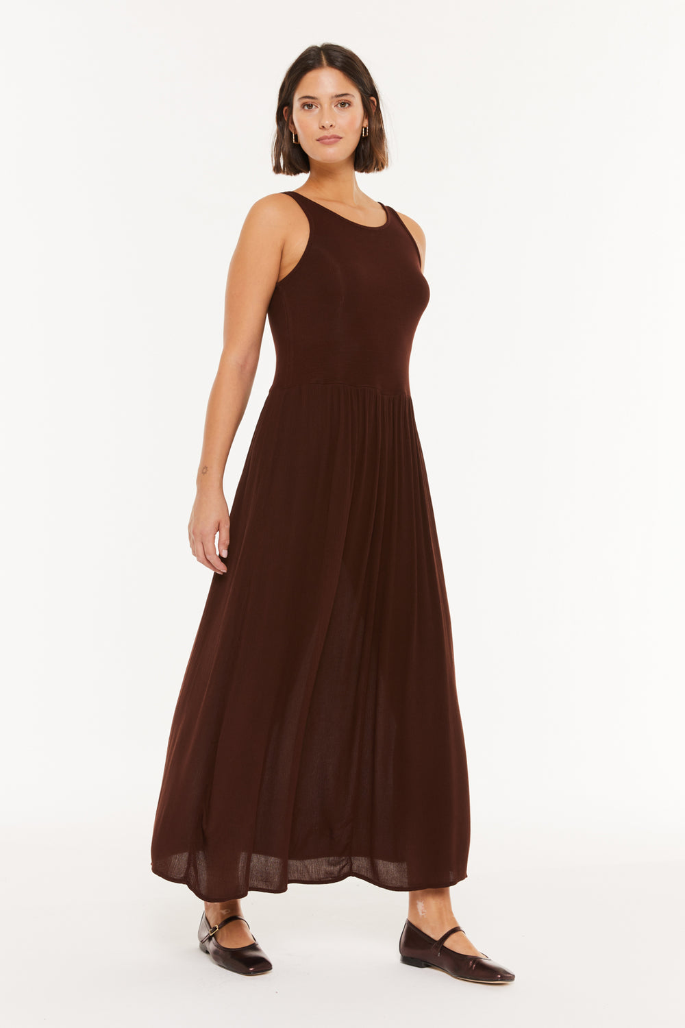 vestido de mujer largo con combinación de tejido de punto y plana, escote redondo . Prenda sostenible.