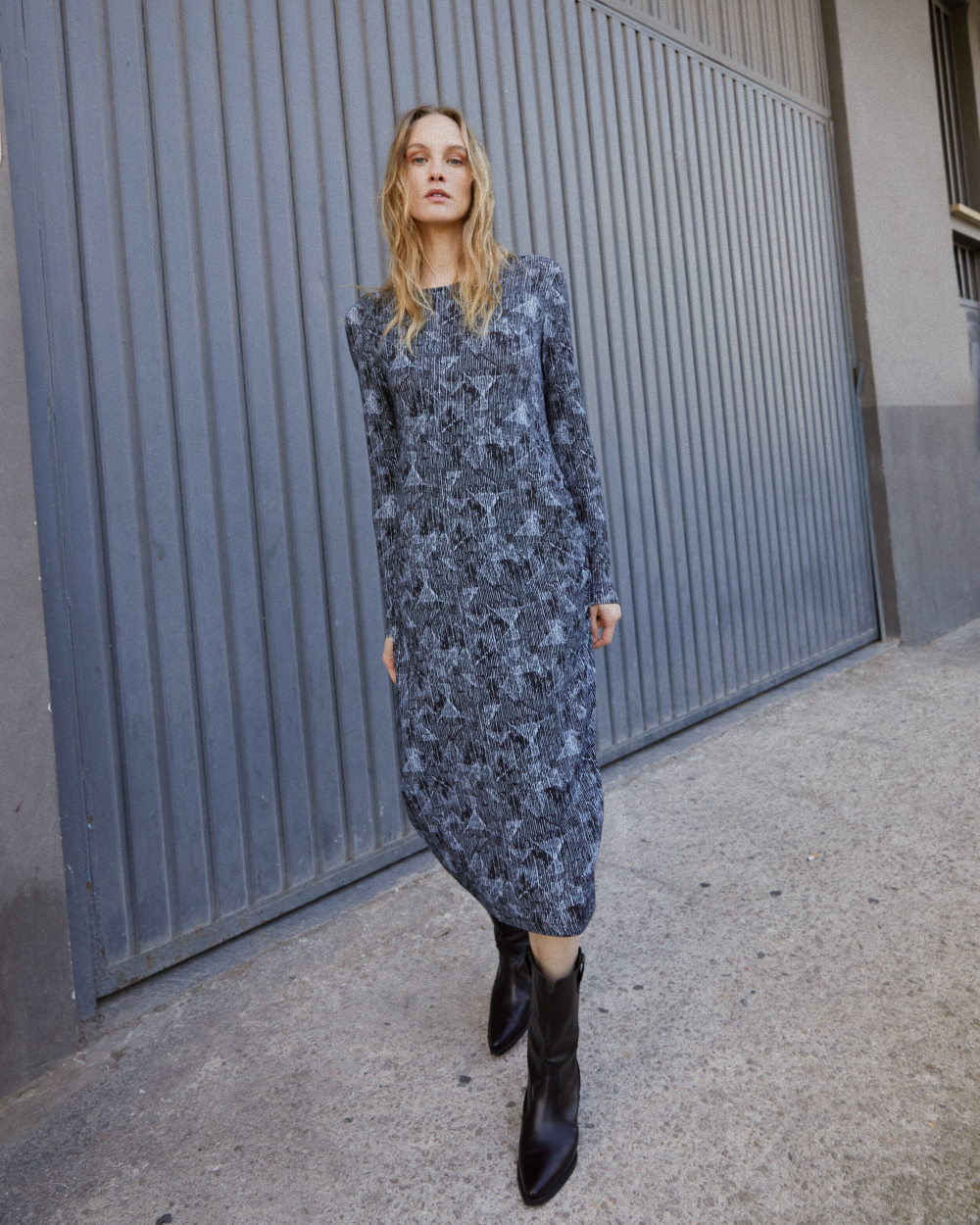 Vestido confort de mujer, con estampado bicolor, escote redondo y manga larga. Prenda sostenible.