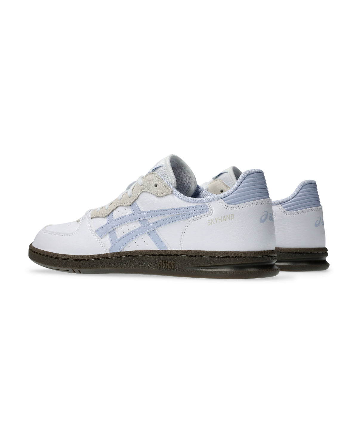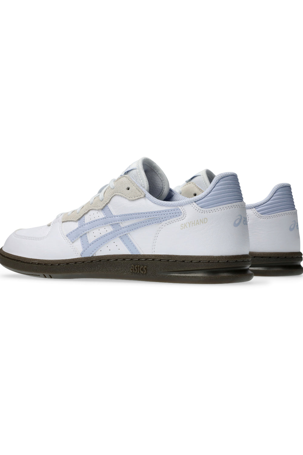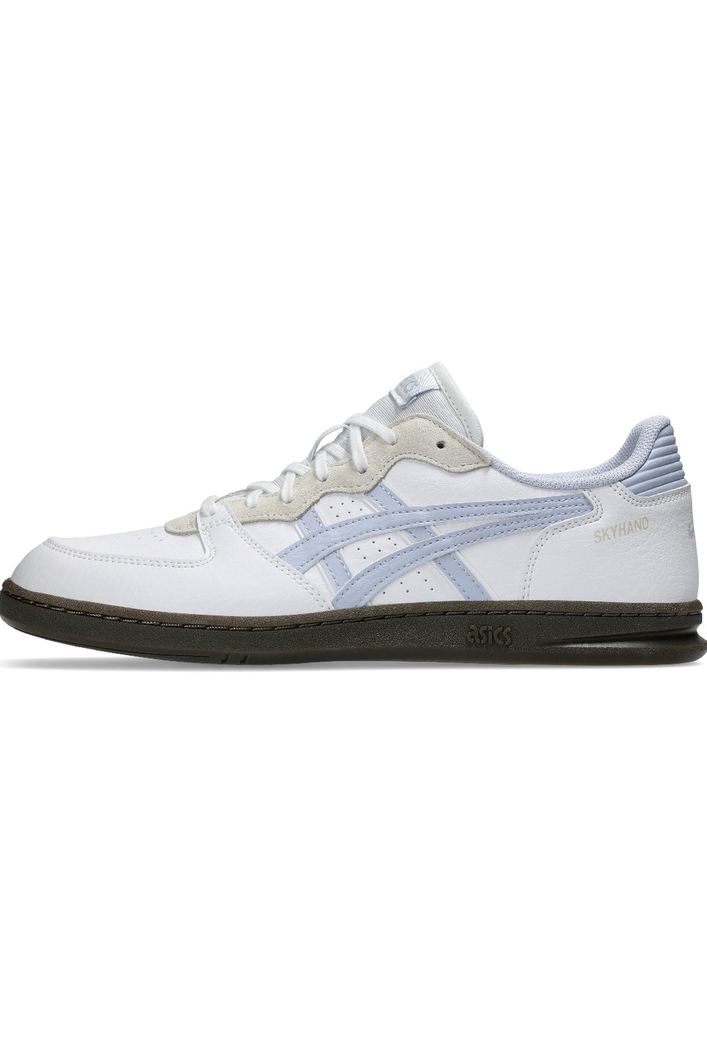 Zapatilla Asics Skyhand OG blanco y azul claro. Cuenta con paneles de cuero sintético y ante y la suela de goma.